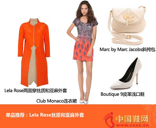 在夏末秋初,橙色的服饰无疑是很适宜这个浪漫季节的选择。气质十足的橙色外套由于色彩的艳丽,不会给人更大的距离感。一面采用结构感真丝面料,另一面采用黄褐色亚麻面料,内外两面均可穿着的设计带来更多的可能性。在大衣里面可以搭配一件印花连衣裙,明亮色调和浪漫气息印花设计更加动人。精美褶皱凸显款式的经典气息,小肩袖和低圆领完善柔美外观的美感。搭配一款金属色鳞片蛇纹压花皮革浅口鞋,带来时尚光泽。再加上一款浅色的米色单肩包就可以美美的出街或者上班了。