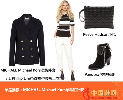 在秋季每个MM都应该拥有一款经典款式的短外套,经典的蓝黑色水手短外套必将成为秋季的首选单品。羊毛混纺设计凭借金色纽扣和肩章增添了一份帅气军装风。可用其搭配从紧身牛仔裤到精裁长裤等任何下装。这样一件海军风的外套非常适合搭配一件同样风格的条纹内搭,选择一款腰裙上衣饰有鲜明条纹,带来清爽图形元素。搭配一款中性风格的压纹皮革小包帅气十足。鞋子可以选择短靴,工业风明拉链在这款如天鹅绒般柔软的反绒皮短靴上剪裁出清晰线条,十分个性帅气。
