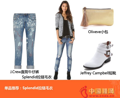 休闲舒适的小外搭是初秋的必备单品,无论是外出还是坐在办公室都是非常实用的。条纹和撞色饰边的毛衣外套带来时尚魅力。通常都不会拉上拉链,显得休闲舒适百搭。选择一款街头风的牛仔裤,大胆利用白色、红色和蓝色打造出泼溅绘画效果,极富艺术气息,与本季流行的仿旧风潮不谋而合。直筒和中腰设计,既能凸显曼妙身材又易于搭配。不妨卷起裤脚,突显你最爱的美鞋。可以搭配一双白色的帅气短靴,镂空设计为这款柔软的皮革短靴增添了时尚气息。包包方面可以选择经典的金属色手包,加上拉链上马毛拉环的设计,精美十足。