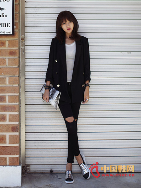 黑色,整体感觉简约又精致,金属的纽扣开襟很显质感,宽松版型,肩部有垫肩的处理,显得相当有范儿,修身的T恤和破洞小脚裤搭配,帅气都市范儿。