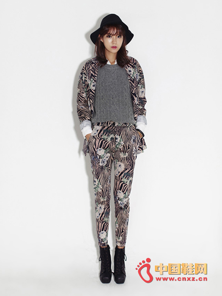 秋冬季最潮款印花套装,略带点BF风格的宽松夹克+高腰版修身长裤,斑马纹和花朵的混合印染,帅气有型,风格独特又十分抢眼。(合作媒体:)