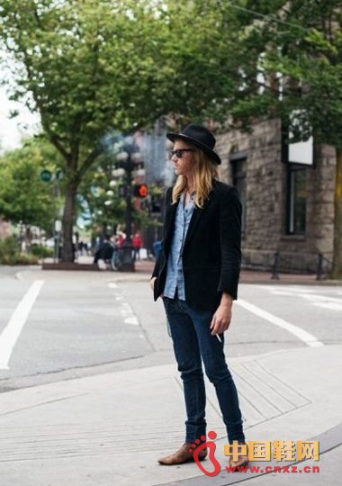 蓝色内搭与深色西装外套,整体有些单调,但搭配上可以应付一切造型风格的经典小礼帽,时尚感顿时Up up。带些不羁的金色长发让这个造型更为舒适。 (合作媒体:)
