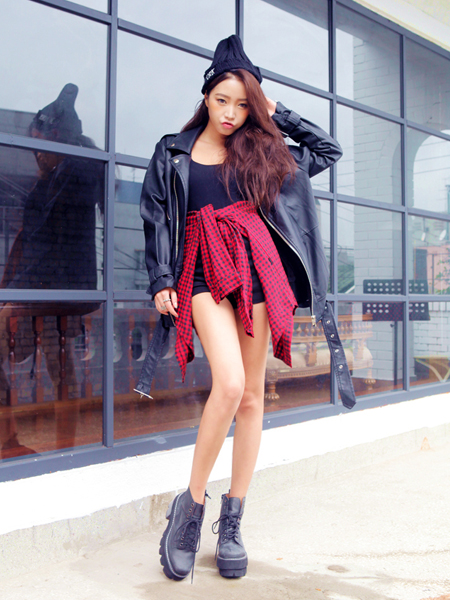 中性魅力的皮革外套,超帅气的款式,适当的宽松度,穿起来很舒服,内搭修身的背心+短裤+各位衬衫,充满了帅气的朋克气息。