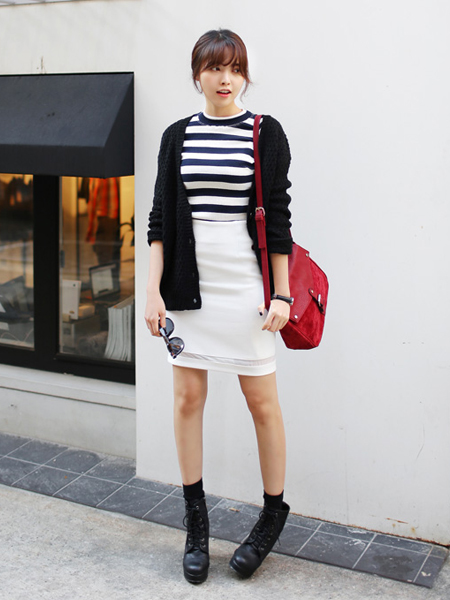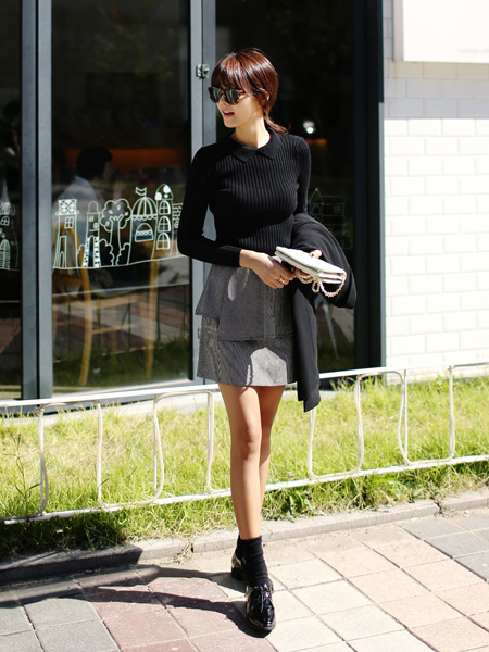 与修身的H版型半身裙搭配,穿出了简单的女人味,裙身部分雪纺拼接,略带一点性感的味道,再搭配上针织开衫,充满女人味且简洁大方。