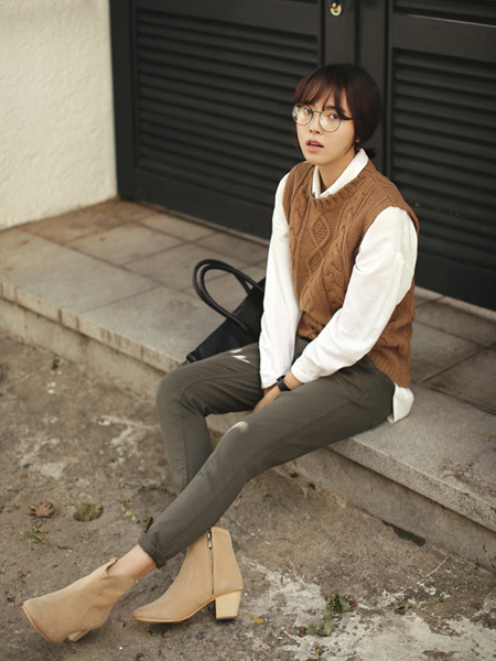 气质款保暖与休闲衬衫的混搭,颇显文艺气质,休闲吊裆小脚裤与高跟短靴的搭配,穿出率性又文艺的气质。