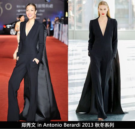 郑秀文(Sammi)这套气场不凡的连身裤来自 Antonio Berardi 2013秋冬系列,作为其秋季时装秀上的压轴之作,与今晚气场强大的Sammi 很是合拍!全身通黑却富有设计感的连体裤有着流畅的线条,事身材看上去格外高挑。