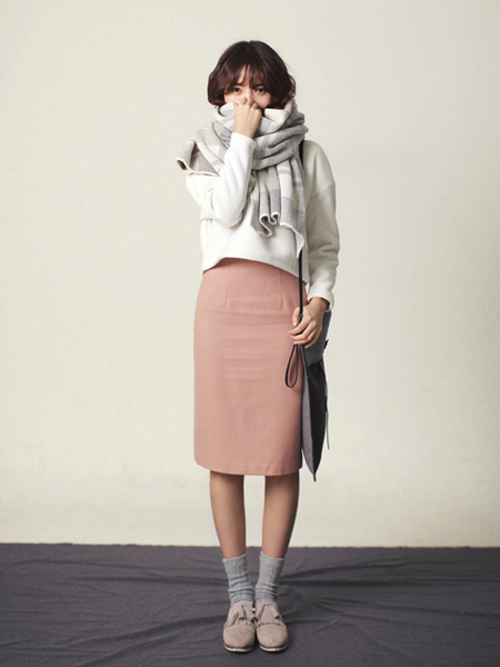 温暖和优雅并存的过膝铅笔裙,针织质地,厚实又温暖,搭配打底裤穿,上搭短款粗棒针织衫,再以印花的围巾装饰,秀出温暖十足的风采。