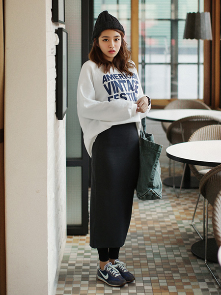 温暖舒适的长款半身裙,拉绒处理,温暖厚实,与打底裤和运动鞋一起穿,在搭配字母印染的宽松卫衣,打造了休闲十足的造型。