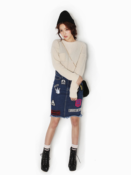 高腰H版型牛仔半身裙,特别休闲,帅气的补丁图案点缀,后身的下摆有开叉的处理,搭配针织衫一起穿,穿起来舒服又有范儿。