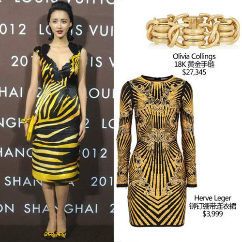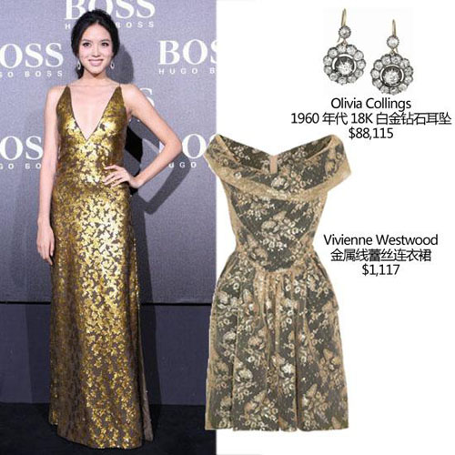 张梓琳出席BOSS北京时装秀,身穿当下最流行的“土豪金”色印花深V礼服,亮相。世界小姐出身的张梓琳气质不俗,虽然穿起了金色礼服,但腰身在众多女星中当属出众的,当天选择的发饰稍显复古,与整体装扮不够协调,但耳畔搭配的黑色宝石耳坠还是能为整体的装扮加分不少。