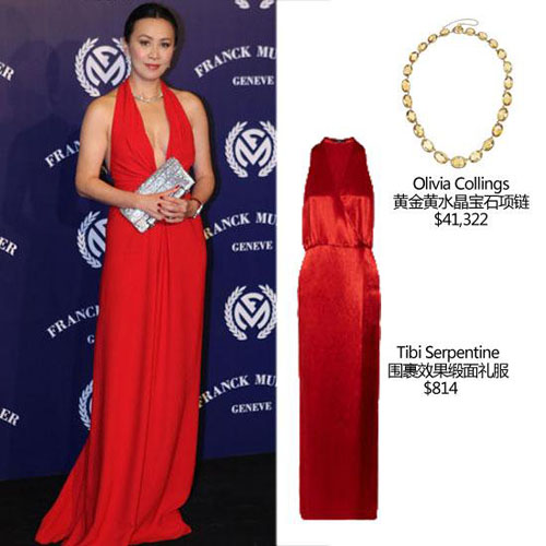刘嘉玲身穿大红色深V礼服,出席Franck Muller品牌手表活动。挂脖设计和最正的大红色两种元素夹杂在一起足够亮眼,在细节上,为了配合整身的红色装扮,刘嘉玲还选择了红指甲和经典红唇的妆容,这样从头红到脚的色彩面积有点大,刘嘉玲深谙搭配法则,用银色来中和色彩上的差异,选择了奢华的白金镶钻奢华项链及耳饰作为装扮,手上也配上了银色亮片手拿包。