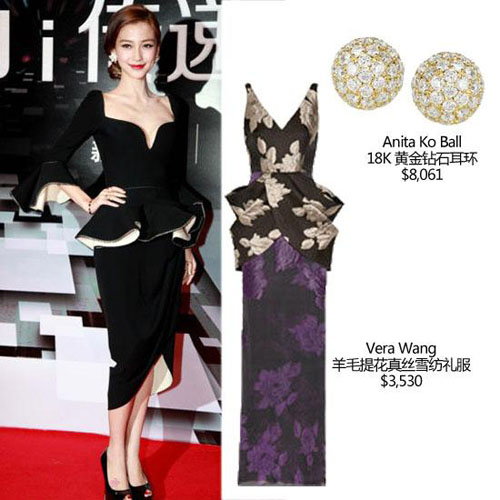 微博之夜Angelababy身穿黑色深V荷叶边礼服亮相,装饰在腰胯部位的荷叶边能够彰显腰身的曼妙,更能够突出女人身材的曲线感,袖口的荷叶边设计唯美华贵,符合Angelababy一贯的风格,耳畔搭配的奢华花朵耳饰,与整体风格统一。