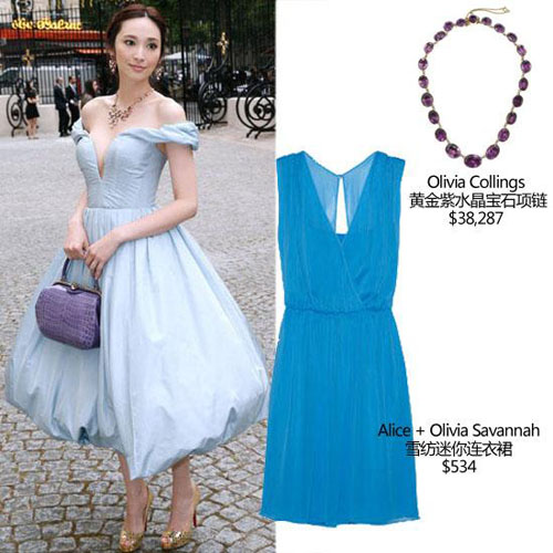 吴佩慈出席Bulgari活动,她身穿Ulyana Sergeenko浅蓝色V领廓形裙,手执紫色漆皮鳄鱼纹手袋,脚踩Louboutin金色鱼嘴高跟鞋。吴佩慈的这身装扮出战时装周可谓是一炮而红,复古的小礼服很符合吴佩慈的气质与活动现场营造的氛围,出彩的小深V设计,正好绽放宝格丽彩色宝石项链的光彩,一举两得。