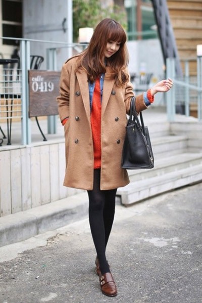 橙红色套头毛衣+牛仔衬衫+驼色呢子大衣+黑色长款丝袜+棕色平底皮鞋+黑色皮革手提包