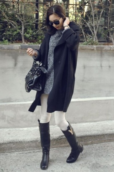 灰黑色套头毛衣+黑色呢子大衣+白色铅笔长裤+黑色皮革高筒靴+黑色皮革手提包