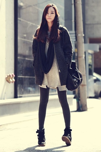 长款T恤+黑色拉链呢子大衣+灰黑色长裤袜+运动鞋+皮革单肩挎包(合作媒体:)