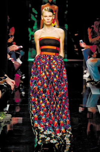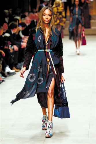 这是Christophe Bailey上任Burberry CEO之后的第一次设计,他完全放开了手脚,将Burberry Prorsum带来了一首波希米亚狂想曲。风衣真正的成为了“风”衣,可以风中飘荡的衣服,也是飘逸感的时装。各种充满异域风情的印花以大块飘逸长巾和披挂式风衣的形式出现,以层叠又飘逸的形式展现胸前的美丽风景。不用立体剪裁或者特殊面料,利用面料、印花和造型,Bailey轻松地利用了最基本的设计元素让时装立体了起来。与此同时,Bailey也成功地再次提醒人们,丝巾在Burberry Prorsum中的重要地位。从此风衣和丝巾,一定要同时出现,当然有一根腰带的协助,更能向最时髦的造型走近一步。