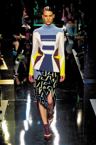 在英国一群同期崛起的设计师中,Peter Pilotto和Mary Katrantzou一样都是数码印花的爱好者。从剪裁来说,他是其中最为大胆的一位,廓形加数码印花,1+1等于100的效果,让他的设计在一干人中最为亮眼。如果说Katrantzou的设计更趋向于女性的衣橱,那么Pilotto的设计则更多来自男性视角。本季他依然执着于数码印花,这一次加上了色块和面料拼贴的新元素、打破了数码印花的单一性。对于许多人来说数码印花最大的问题是太过抢眼以至于只能穿一次。Pilotto意识到了这一点,于是将这些元素全部揉捏在一起,放进万花筒里、旋转出一个缤纷的效果,但其亮眼程度丝毫没有变。