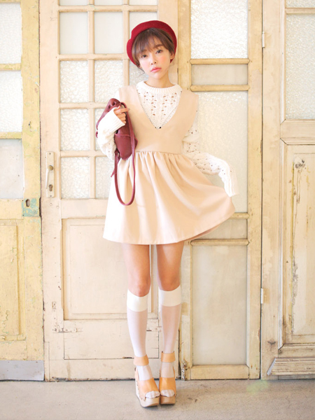 甜美可爱V型背带连衣裙,前后深V型背带,打造经典怀旧风范,腰线附近的碎褶设计,洋溢浪漫情怀,内搭镂空毛衣,助你完美呈现少女般的清新气质!