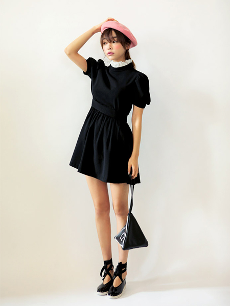 柔美冯连身裙,配色荷叶边小立领,柔美气质立显!泡泡袖与腰部的百褶相互辉映,表现可爱女生别样风情。配色白色领部点缀,增添几许生动感,甜美,青春又典雅。
