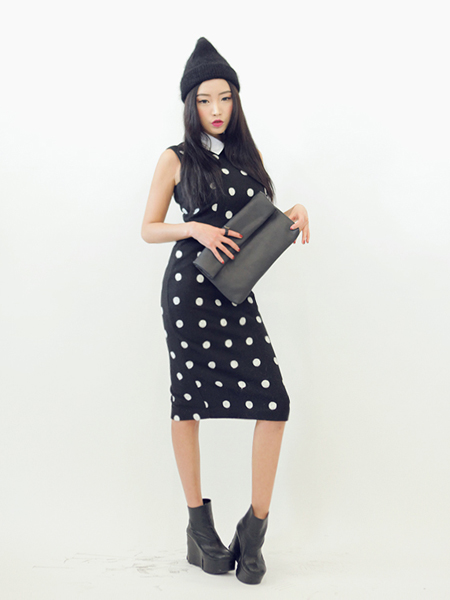 时尚个性的波点无袖连衣裙,修身的及膝款,优雅知性,但也很随性,而且相当惹眼,简约的搭配高跟短靴,就能展现简约的造型。