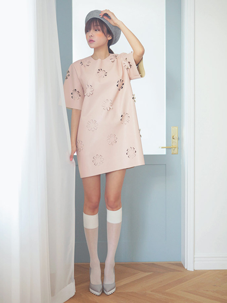 花朵镂空皮连衣裙,独特的镂空花朵,富有艺术美感,宽松的H版型,展现出清新的少女感觉。(合作媒体:)