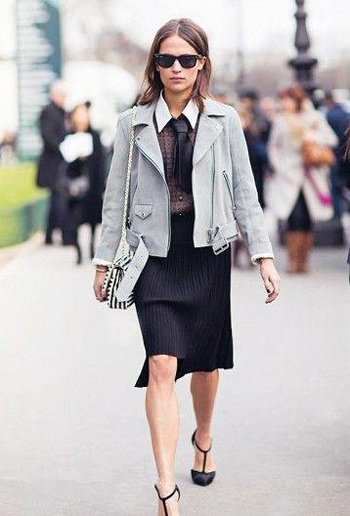 一条合身的牛仔裤穿在短裙里面既能御寒,也有意想不到的混搭效果哦。