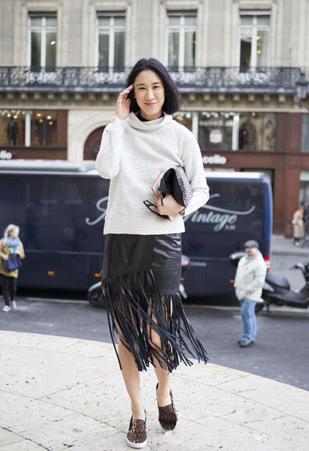 《Lucky》杂志执行主编陈怡桦(Eva Chen)简约的黑白搭配因裙子下摆的流苏而不在沉默,狂野的甩出了霸气。