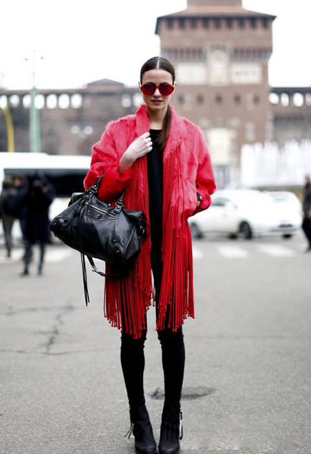 一身黑用一件红色皮草成为街头亮点,流苏的装饰更是让老气的皮草单品变得活力四射,搭配的红色太阳眼镜也与之相呼应。