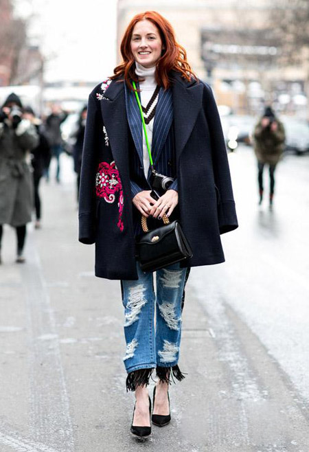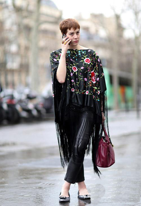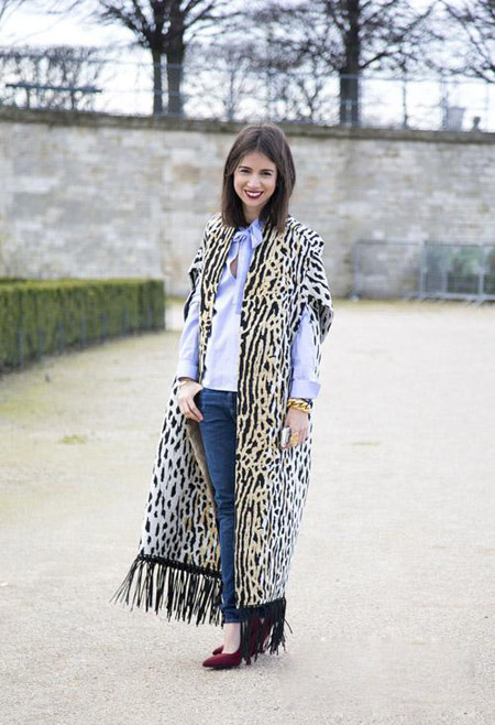俄罗斯时尚撰稿人 Natasha Goldenberg 用一件豹纹流苏斗篷打破了衬衫牛仔裤搭的乏味,值得一提的是,她巧妙的把鞋子颜色与口红颜色形成了呼应。