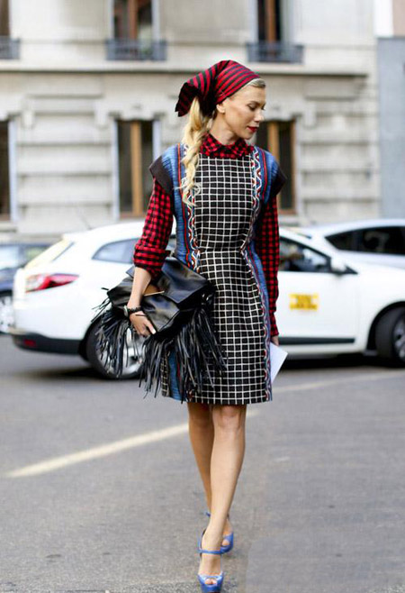日本版《Vogue》创意总监安娜·戴洛·罗素(Anna Dello Russo),红色衬衫搭配薄荷绿流苏裙,对比色的冲击让春季充满活力。