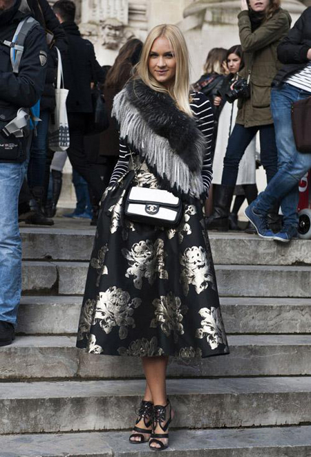 优雅的一袭印花伞裙是名媛一族的宠爱,皮草的点缀也会让你看起来更加上档次的符合身份,选择带有流苏的皮草才不会显得老气。(合作媒体:)