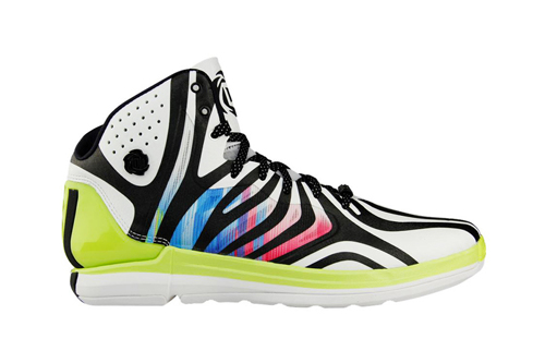 中国鞋网4月10日讯,运动品牌 adidas 近日为 NBA 球星 Derrick Rose 签名式球鞋 D Rose 4.5 释出这双全新的「Messi」配色。设计灵感来自前不久发布的阿根廷足球明星 Lionel Messi 全新战靴 F50 adizero TRX FG Messi,沿用其色彩斑斓的配色组合,通过粉、蓝、荧光绿和黑白攀附于轻量鞋面上营造十足醒目感。(合作媒体:)