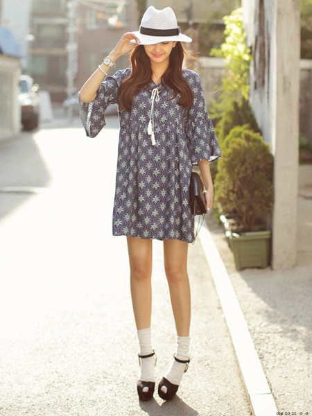 民族风印染的连身裙,很有异国风情的一款,领口和袖口的剪裁也很特别,领口还有系绳的细节设计,再以各种首饰搭配,展现自己的百变魅力。