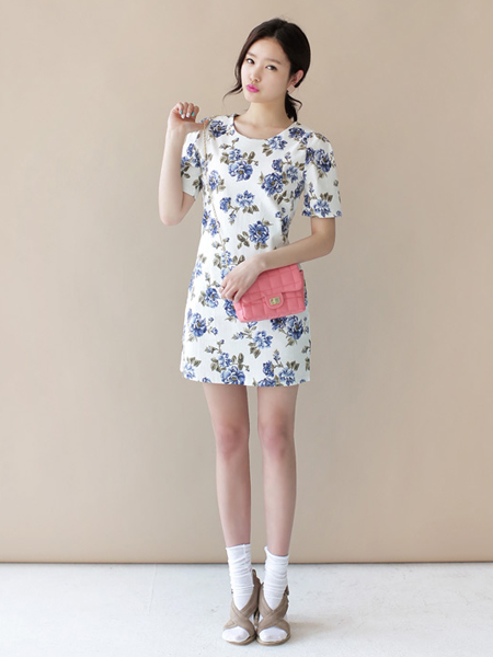花朵图案连衣裙,版型修身,轻便的棉材质穿着舒适,肩部有垫肩配置,肩形好看,展现独有的温柔可爱魅力。