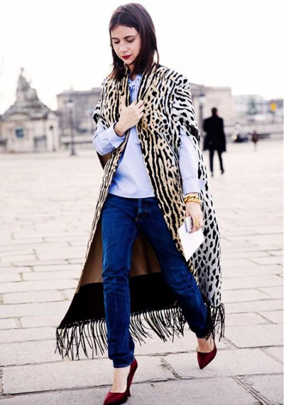 没什么比动物纹更适合秋冬了。充满野性色彩的动物纹今年一定要挑“原汁原味”的,换句话说就是动物原本什么纹路,披到你身上还是一样。比如这姑娘的豹纹斗篷,纵向纹理自然显高,颜色也顺眼,融入异域的流苏元素气场倍增,穿上酒红细高跟就能决战秀场。