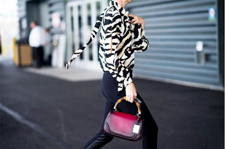 黑白的斑马纹同样是动物军团里的一员大将。当斑马遇上丝绸衬衫,飘逸的优雅立即显露无疑。顺便问一句,姑娘你的竹节包这么好看是想气死谁?