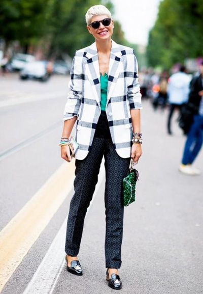 既能优雅又能街头的格纹一直都是Icon们的心头好。可和往年不同,今年的格纹搭配里必须得有够“跳”的颜色。这不,经典的黑白格纹因为湖绿内搭和祖母绿手包而立马有趣起来,再加上同样是印花的暗纹西裤混搭,想单调都难。