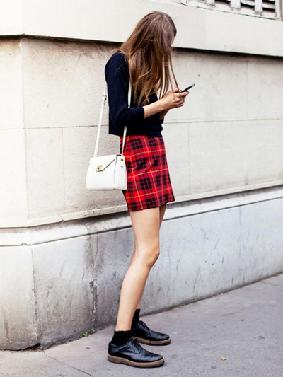 红色的苏格兰纹也是打造秋冬街头经典Look的必备常客。简单的搭配黑色牛津鞋和小毛衣,就要这不刻意的潇洒。