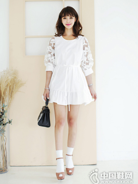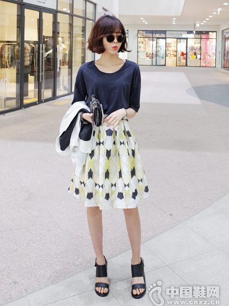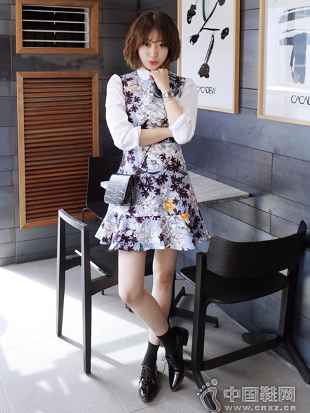 印花连衣裙款式,简约的圆领子设计,腰部显瘦的线条设计,下摆是喇叭的裙摆,和白色衬衫层叠式穿搭,展现出简练的利落感。(中国鞋网-最权威最专业的鞋业资讯中心。合作媒体:)