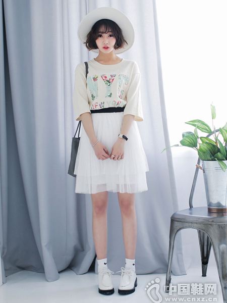 女人味魅力的纱伞裙,很可爱的款式,简练的欧根纱材质,蓬松的线条感,搭配上休闲字母T, 强调清爽活泼感。
