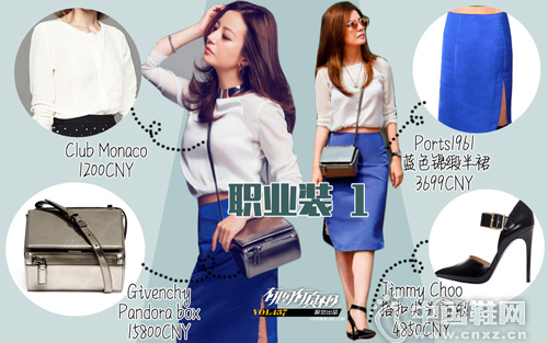这套职业装是在剧中出镜率比较高的一身搭配了,因为还穿着拍了宣传海报。不得不说,用银色的Givenchy潘多拉盒子搭配ports1961的宝蓝色包臀裙实在太过机智。这两个看似没有交集的品牌用撞色的设计搭配出了极富时尚感的职业装。再加上保守的白色T恤和黑色高跟鞋基本上是不会失误又有看点的一身装扮了。所以说,Givenchy可不光是年轻的少男少女们的选择,荷包满满的白领们也可以考虑入手一个呢。