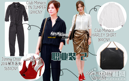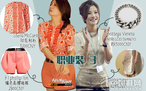 赵薇在电视剧中的职业装都是非常中规中矩但又别有一番嚼头的打扮。黑色的连体裤有点过于沉闷,别上长链条的耳坠增添时尚感。再配上同样在剧中出镜率很高的stella mccartney金色链条大号包是极好的。Mccartney是chloe的设计师,自己创立了一个不用皮草的品牌,所以他家的包包这么贵还不是真皮了,也是挺棒的。同样来自club monaco的白色衬衫搭配金色的半身裙实在太过闪耀,然而好强的毕胜男还不甘寂寞的选择了红色的高跟鞋作为搭配,果然是公司里老大的角色才敢穿得如此张扬去上班啊。