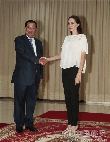 朱莉获柬埔寨首相会见 以黑白造型现身利落干练