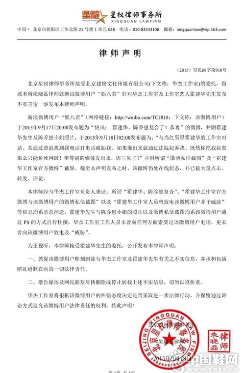 随后,工作室发出声明,要求微博用户“娱八君”删除不实信息,并承担包括赔礼道歉在内的一切法律责任。
