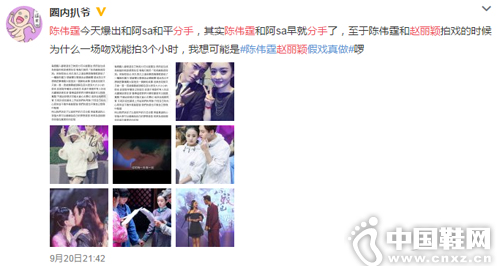 中国鞋网9月21日讯, 9月20日凌晨,陈伟霆与阿Sa突然发表声明承认情变,并表示两人已和平分手。不过就在两人友好分手消息传出不久,就有网友在微博爆料称,其实陈伟霆是因恋上赵丽颖而主动分手,消息一出惊呆无数人,不过也有网友跟帖说,“之前两人拍吻戏啊!!拍了足足3个小时,不是在一起怎么可能吻那么久啊?!”陈伟霆与阿sa的身边好友针对一说就否认,力证两人分手无第三者插足。