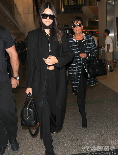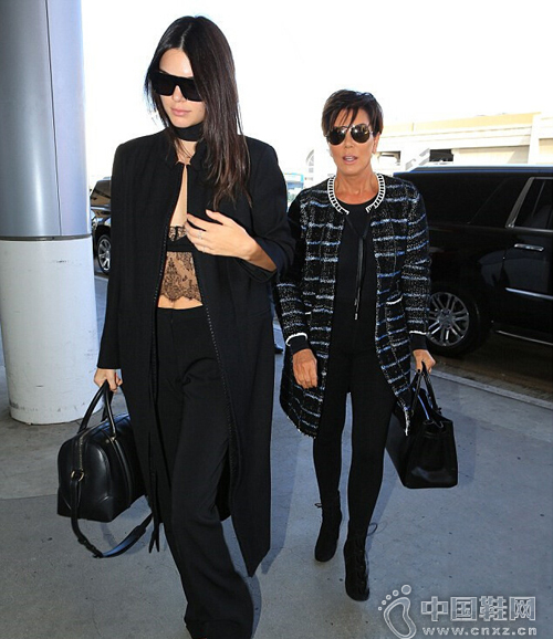 中国鞋网9月30日讯,肯达尔-詹娜与母亲现身美国洛杉矶机场。肯达尔蕾丝内衣外穿黑超遮面扮酷,老妈克里斯变小跟班。