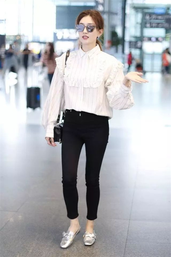 江疏影在机场长腿霸屏了,她穿着一件条纹白衬衫,荷叶边的设计增添了一丝女人味,下身搭一条黑色裤子,好显瘦啊!