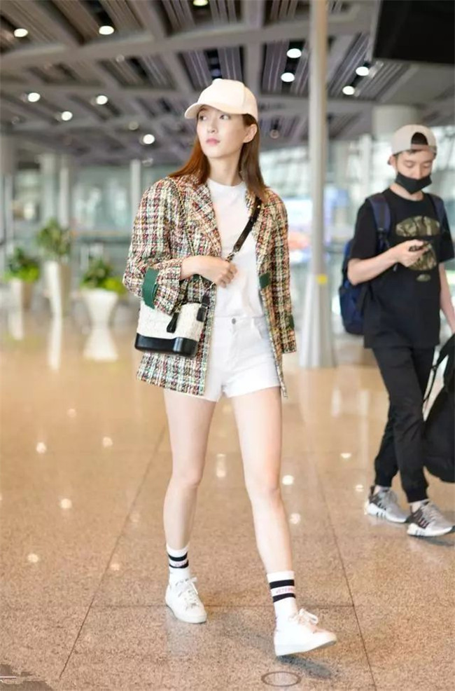 在机场穿白色T恤搭同色短裤,这样露出的大长腿显得白皙又纤细,脚上搭白色鞋和白袜子,这样穿搭更显时髦范。
