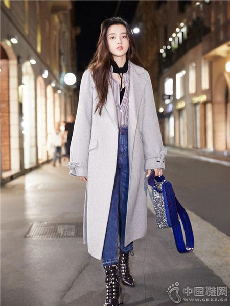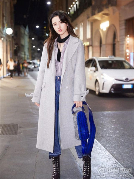 区别于暖色系的驼色,冷淡风格的浅灰色大衣更衬气场。宋祖儿展示的这一套造型,choker设计的针织搭配利落条纹衫,演绎叠穿经典;下身一条蓝色牛仔裤和黑色短靴,看起来非常帅气干练,一款蓝色的手包与牛仔裤互相映衬,街头范儿十足。